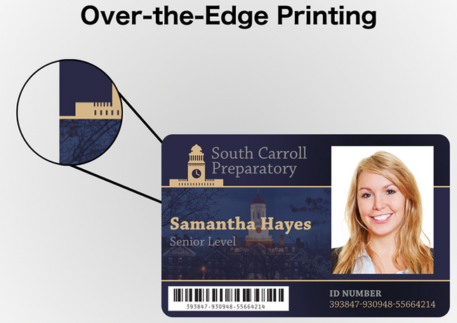 Over-the-edge printing is a print method that leaves no visible border around the edges of your printed ID card. This print method is available on reverse-transfer printers, also known as retransfer printers.