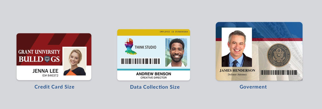 This helpful, true-to-size infographic illustrates the three most common card sizes, including their dimensions and common uses, to answer the question: What size ID card do I need? Remember: this is just a guide, not a rulebook. There's nothing wrong with having credit card-sized government ID, or a data collection-sized student ID!